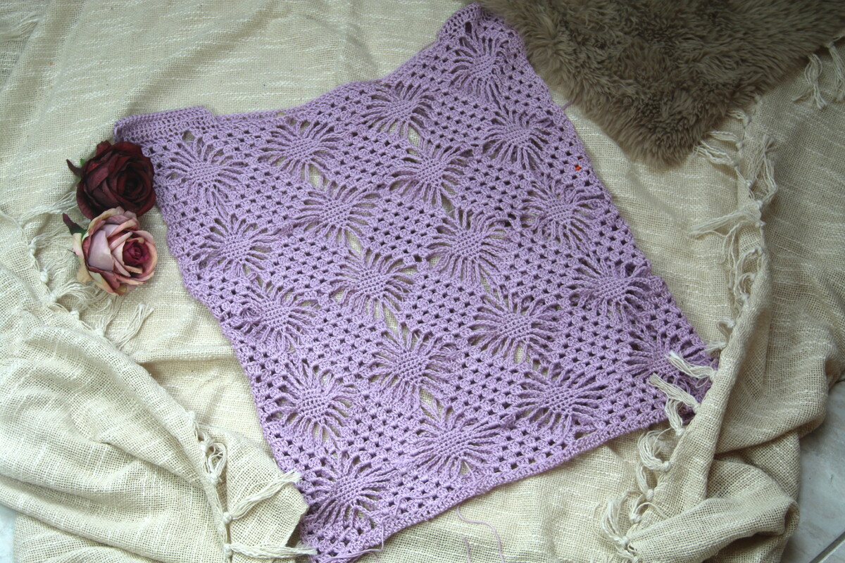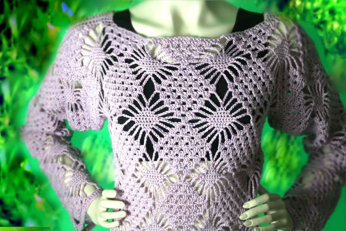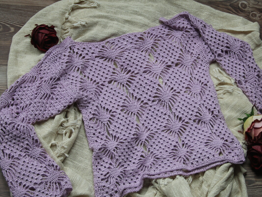 What a statement piece! In a gorgeous lilac color you simply must have. This sweater has a very casual vibe. It features a straight, loose fit. The pattern it’s a dream! Tight stitches form diamonds that are bordered by chain stitches next to groups of double crochets. This creates the airy, graphic pattern. It’s not rocket science and is easy to work. The yarn has a wonderfully soft drape without looking shapeless. The front and back are crocheted separately in back-and-forth rows, from the bottom up. The shoulders are sewn together. The sleeves are crocheted in back-and-forth rows from the bottom up. Then the pieces are assembled.