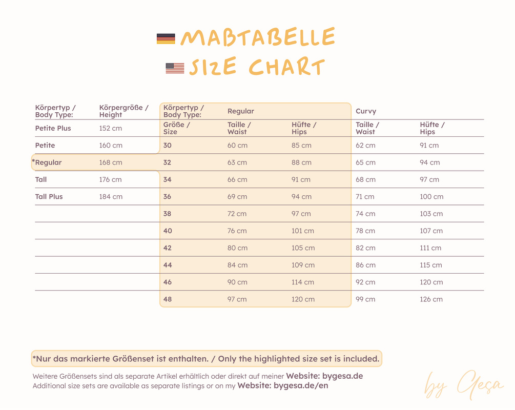 | Regular | 30 - 42 | 126 cm | Regular Curvy | 30 - 38 | 126 cm |