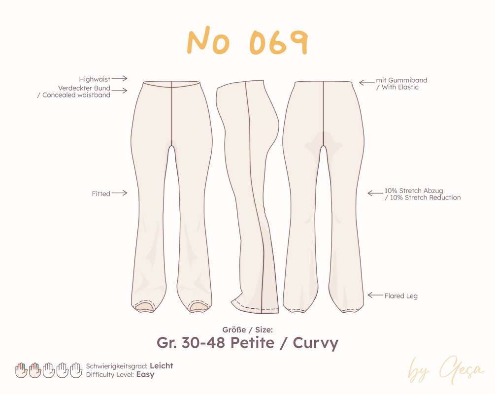 They are sewn from stretch jersey. Make sure your fabric has enough stretch so the pants feel comfortable and move well. The pattern is quick to cut because it uses only two pattern pieces. The instructions guide you through each step in a clear way.