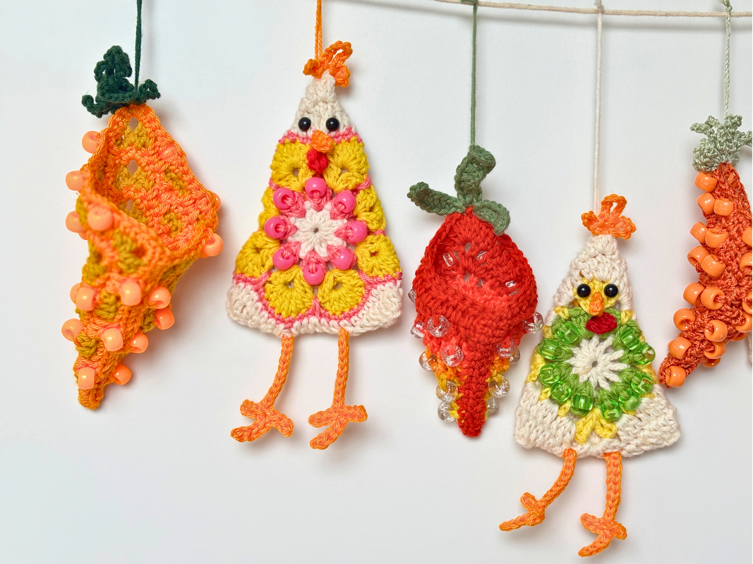 This detailed PDF guide teaches you how to create whimsical "Crazy Chickens" in a modern Granny Square style and matching beaded carrots. The carrots are cleverly designed to be filled with small chocolate eggs—making them the perfect party favor or a standout highlight for your Easter garland!