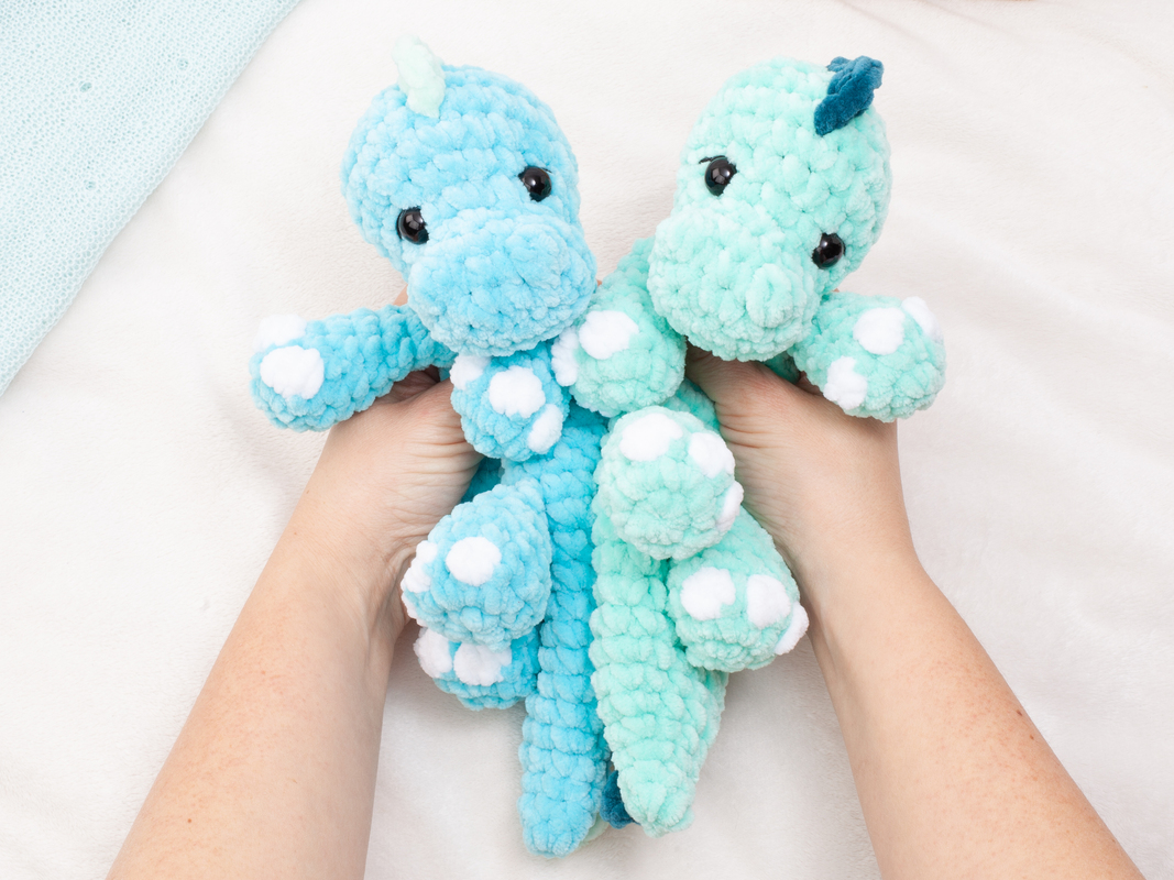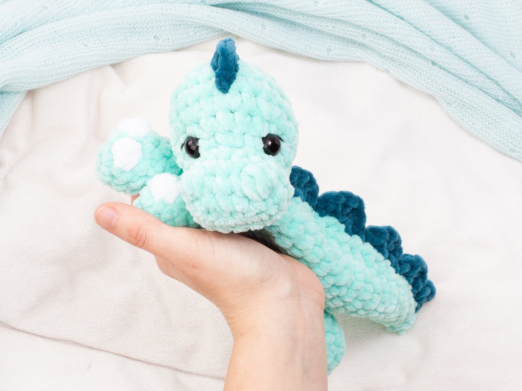 Using the recommended yarn and hook, your crochet dinosaur lovey will be approximately 27 cm (10.6 inches) tall.