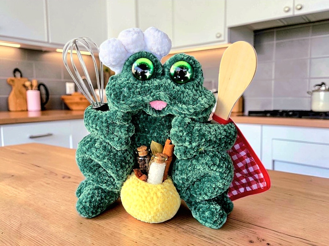 This cute frog is much more than just an amigurumi. It combines practicality with a charming design, making it a real eye-catcher in everyday life. Whether on your desk as a pen holder, in the kitchen as an eye-catcher, or as a decorative element on a door or wall—Sir Croak-a-lot brings charm and organization to any space. This little frog also makes a very special gift. It’s perfect for moving into a new home, the start of school, a birthday, or as a small token of appreciation, and is guaranteed to bring joy.