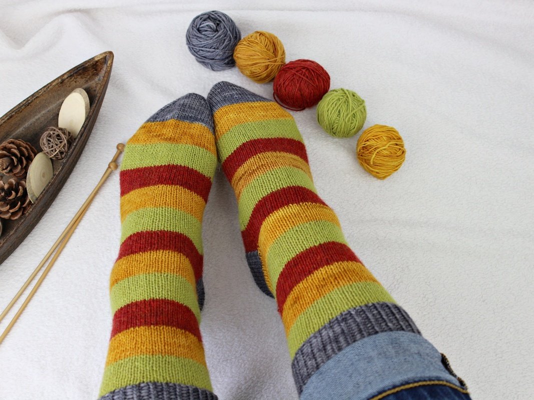 The “Happy Scrappy Socks” are comfortable, wearable, and full of personality. Each pair becomes one of a kind thanks to the playful stripe combinations – ideal for everyday wear, cozy knitting sessions, or as a handmade gift.