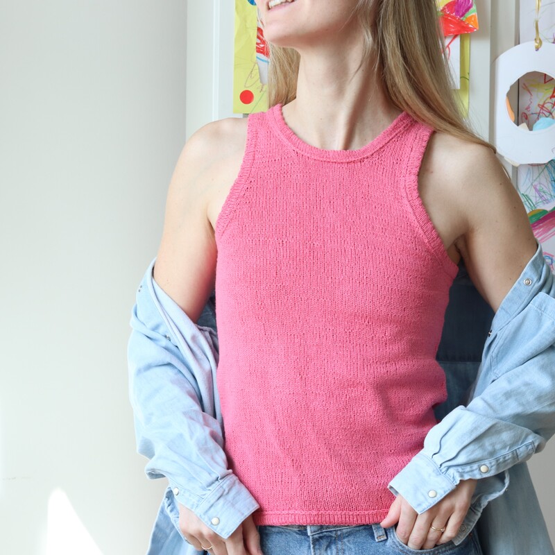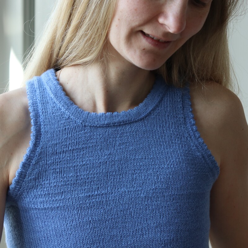 The top is worked from the top down, allowing the length to be adjusted individually. To create the distinctive edgings, stitches are picked up along the armholes and neckline. The armhole edgings are folded inward and stitched down, while the neckline edging is folded outward and also stitched down, creating a thoughtful contrast in detail.