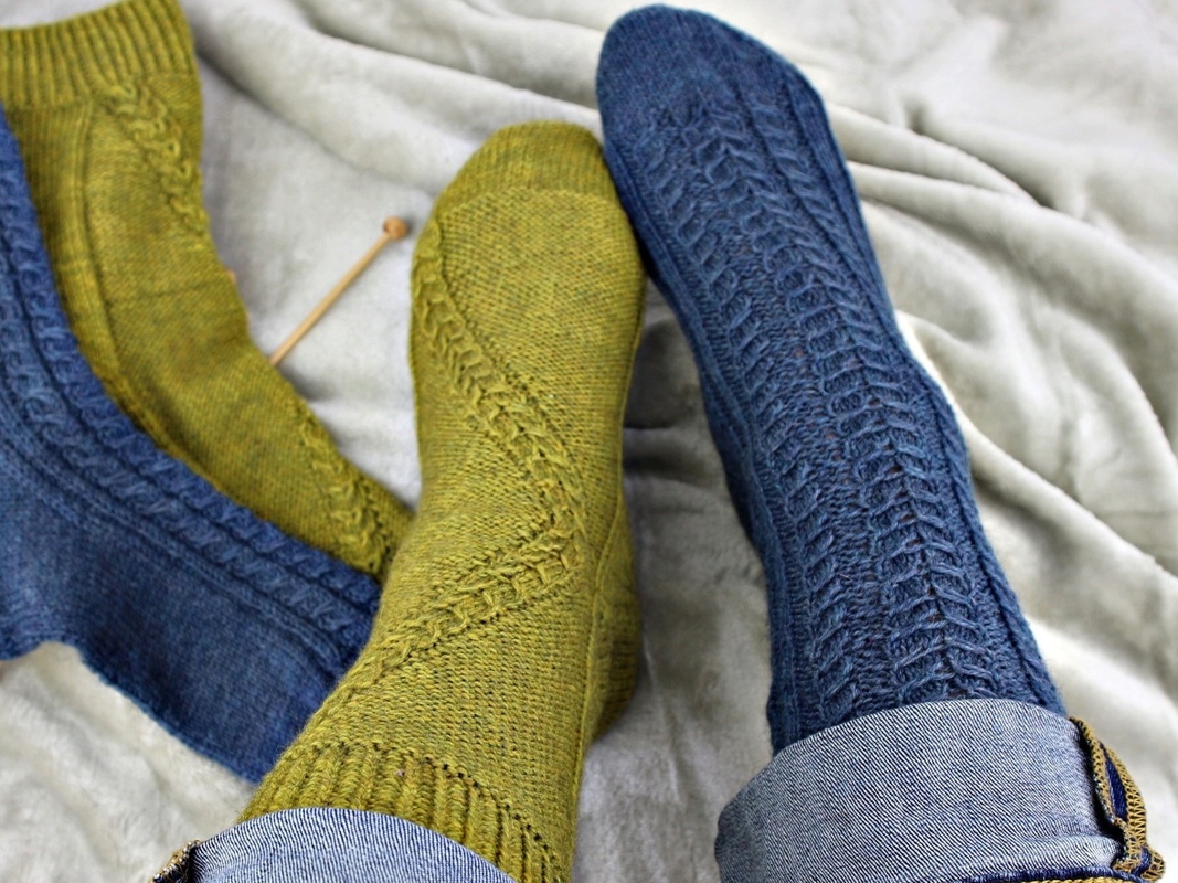 This knitting pattern set includes two cable sock designs, each with its own unique texture and character. Both patterns are worked top down in the round and combine classic sock construction with decorative cable elements.