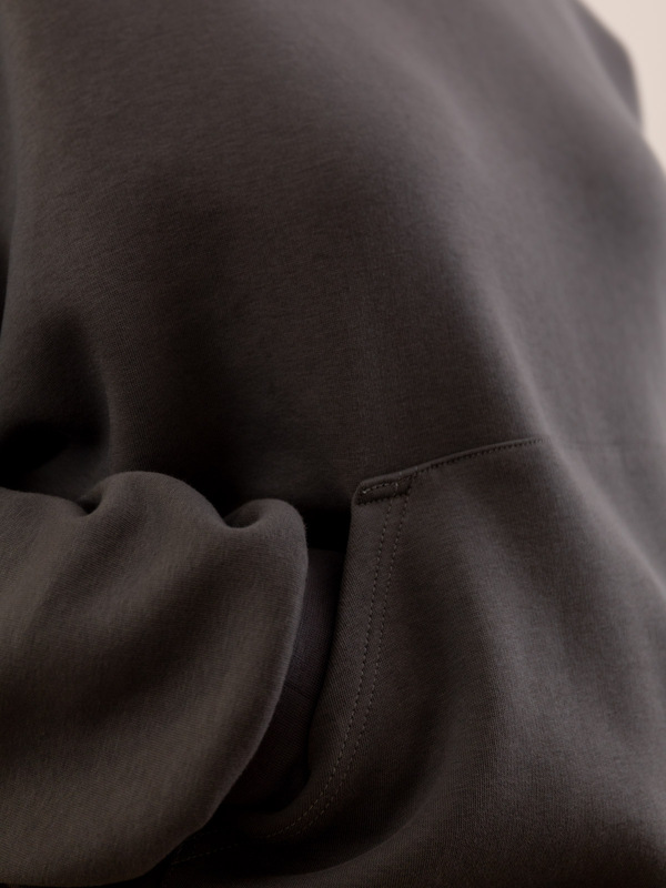 The hoodie is hip length with a straight hem and a separate hem band. It also features a large hood with a slight overlap at the front (just a few centimeters), which gives it that extra cozy feel.