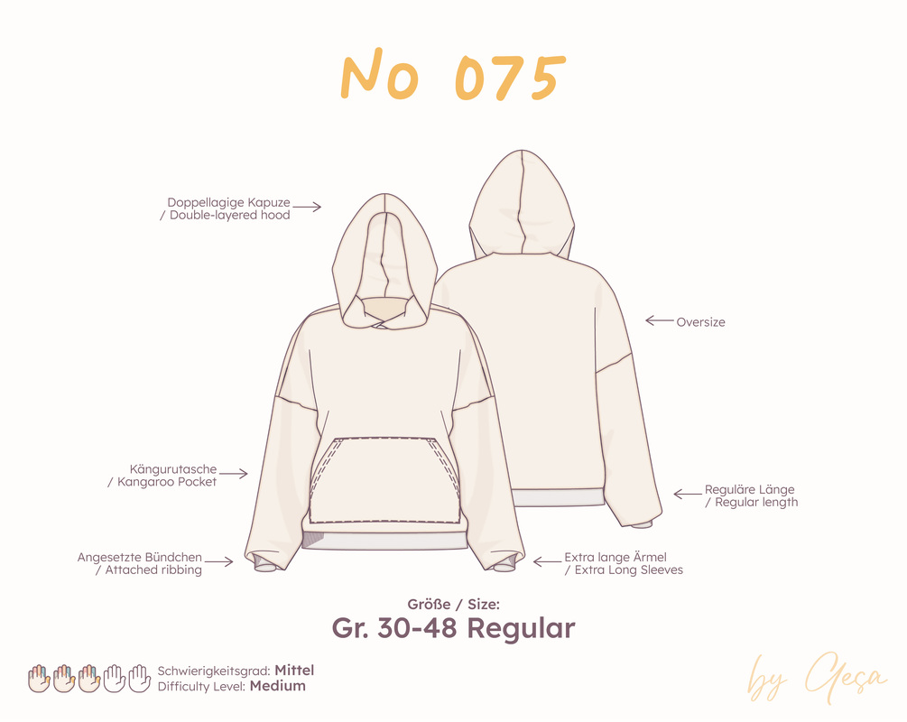 If you feel like adding your own touch, this hoodie is perfect for it: contrast ribbing, a small label on the kangaroo pocket, decorative topstitching, color blocking, or length adjustments. And if you want to add a drawstring to the hood, you’ll find the exact method in the included basic knowledge guides.
