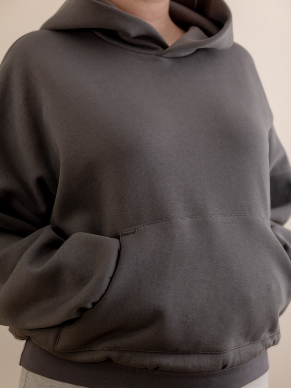 The hoodie is hip length with a straight hem and a separate hem band. It also features a large hood with a slight overlap at the front (just a few centimeters), which gives it that extra cozy feel.