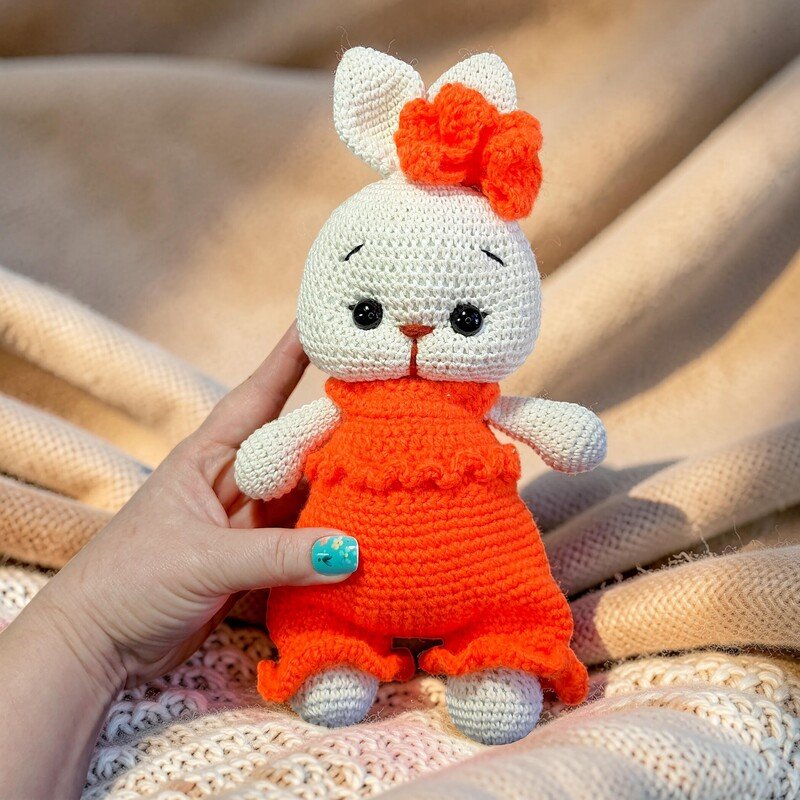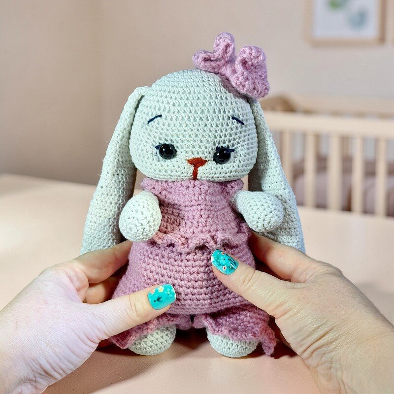 This crochet rabbit is the perfect size for cuddles! When finished, your bunny plush will stand about 10.24 inches (26 cm) tall.