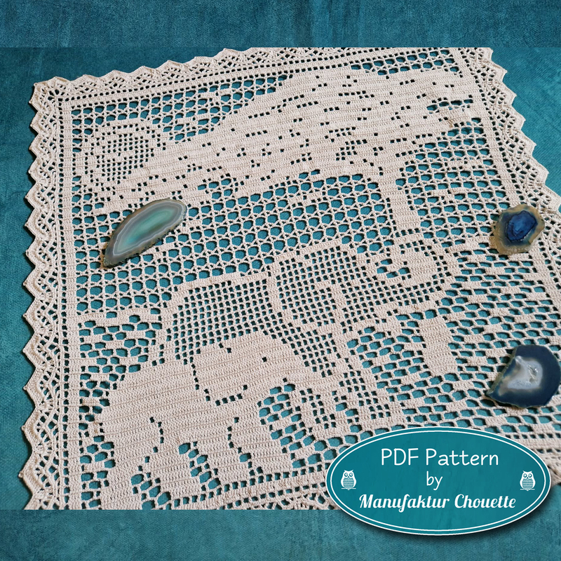 For all elephant lovers, there's also a square doily from the elephant collection. This doily looks lovely even on a round table. This doily is started at the bottom edge.
