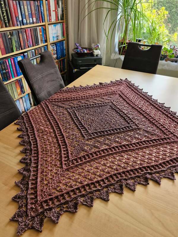The tablecloth on the cover picture has the following dimensions: 95 x 95 cm. The small version is 70 x 70 cm large, the medium size version is 85 x 85 cm large.