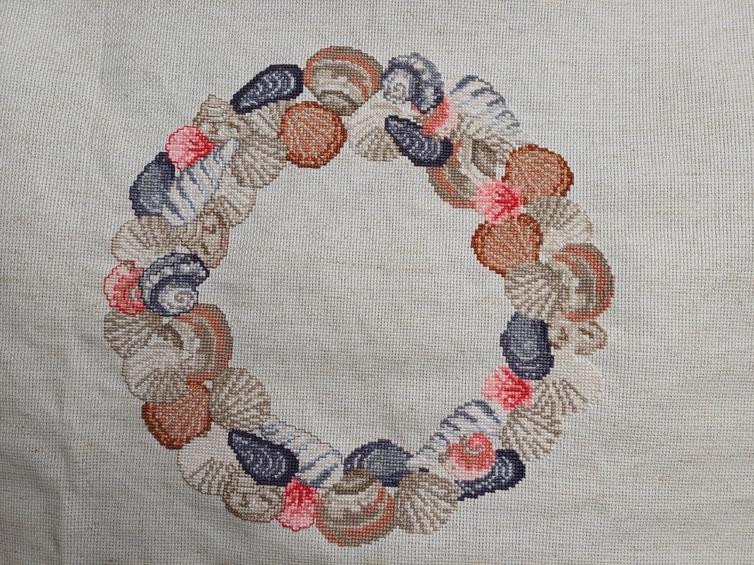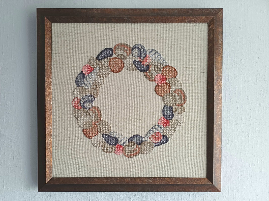 Stitch a naturalistic seashell wreath for nautical-themed decorations and bring a touch of summer into your home. Do you enjoy stitching with frequent color changes and find relaxation in the focused counting of the stitch pattern? Then this embroidery design is the perfect new project for you.