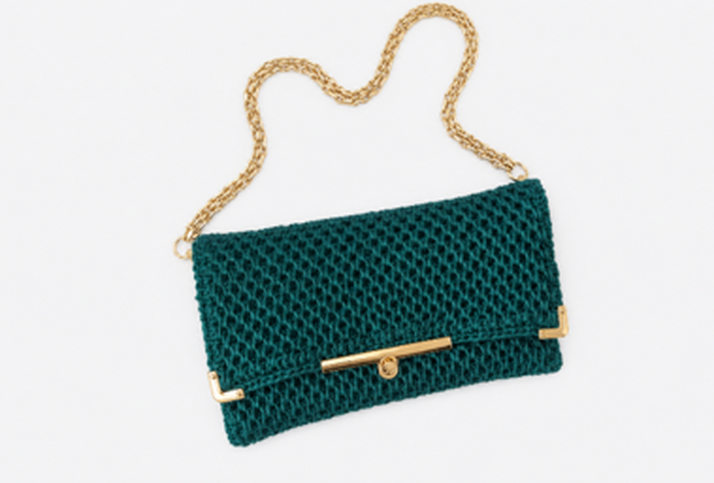 The clutch impresses with its compact, rectangular shape and fold‑over flap, as well as its even, textured crochet pattern that gives it a luxurious look. The detachable chain strap allows the bag to be worn both as a shoulder bag and as a clutch.