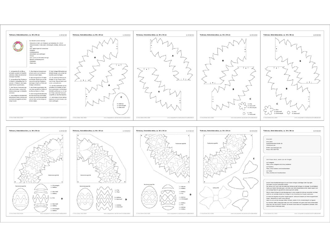 Der Kranz ist sehr einfach nachzubasteln und es bedarf hier keine besonderen Kenntnisse und Fähigkeiten außer etwas Ausdauer. Wenn du gut mit einer Schere umgehen kannst und bereits mit Klebstoff gearbeitet hast, dann wirst du diesen Kranz ohne Mühe nacharbeiten können. Bei Zusammenfügen der einzelnen Motivteile und des Kranzes helfen dir die Positionierungs- und Aufbauzeichnungen.