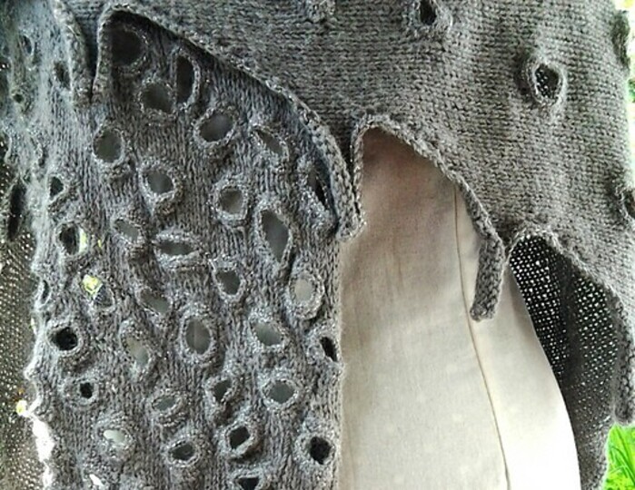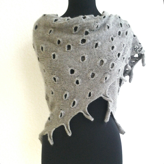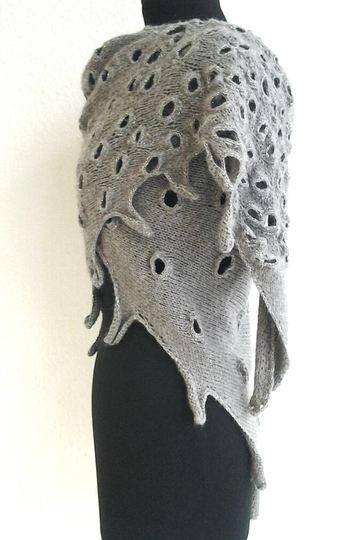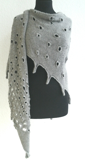Das Modell Mondkrater (oder auch Luna) ist etwas ganz Besonderes. Es ist ein asymmetrisches Dreieck mit großer Spannweite. Die Krater kannst du nach eigenem Geschmack und Fleiß dosieren und anordnen. Die Ausarbeitung der Krater ist eine Fleißarbeit, denn jedes Loch wird einzeln umhäkelt.