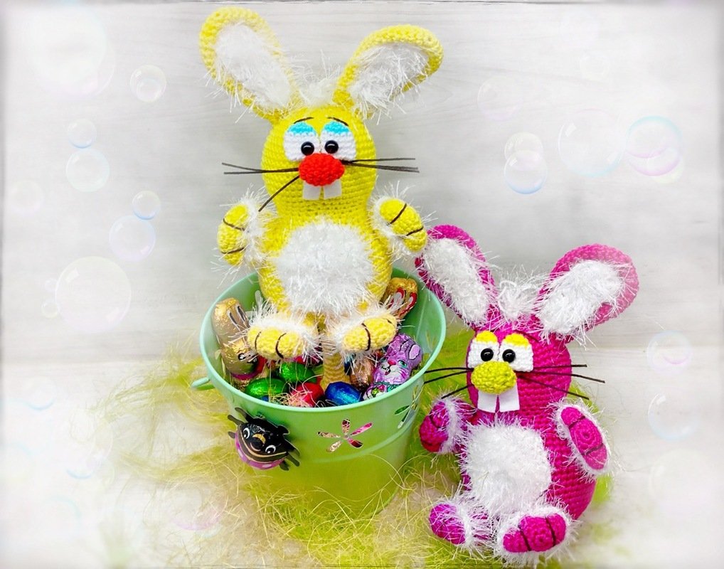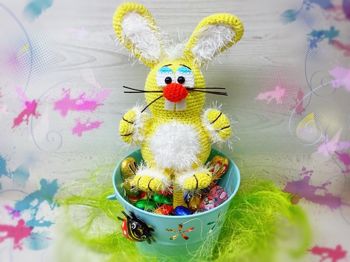 The cute bunny can be worked as a plug for flowers and candy pots, or while sitting to cuddle.