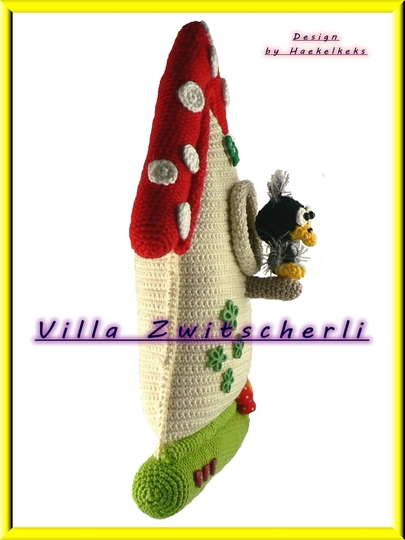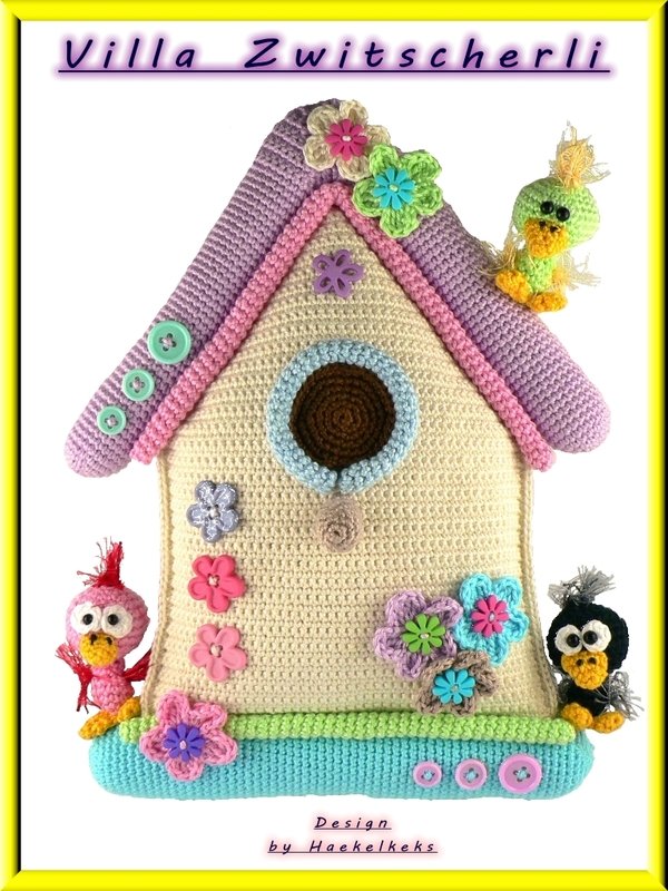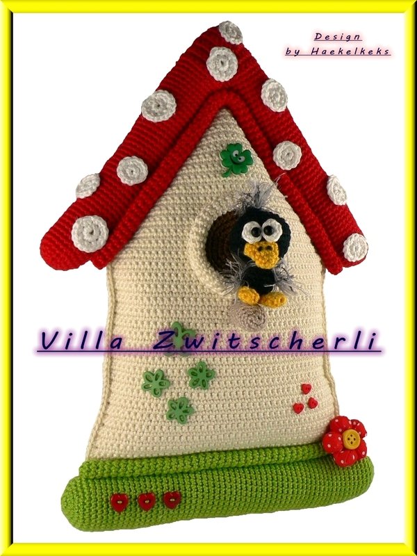 We sell here the suitable, easy to understand and illustrated crochet pattern to the door hanger birdhouse "Villa Zwitscherli".