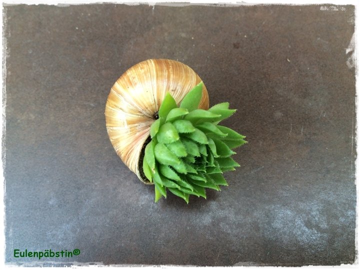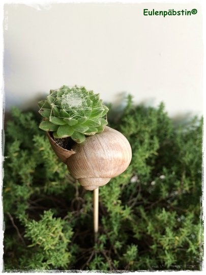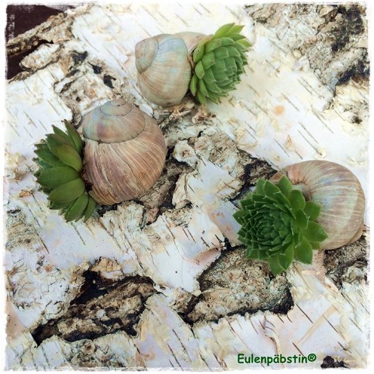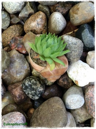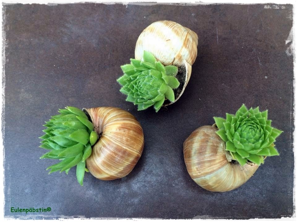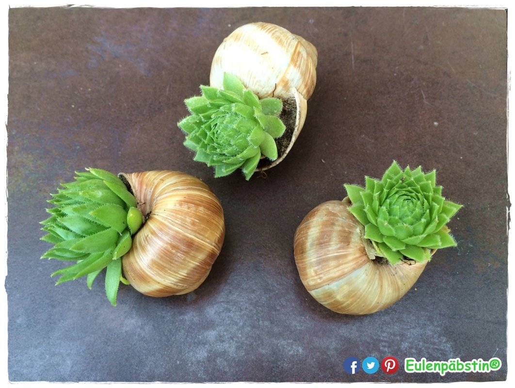 Da das Sempervivum winterhart ist, übersteht es auch kältere Tage. Eure bepflanzten Schneckenhäuser eignen sich somit auch für Balkon- und Grabgestaltungen.