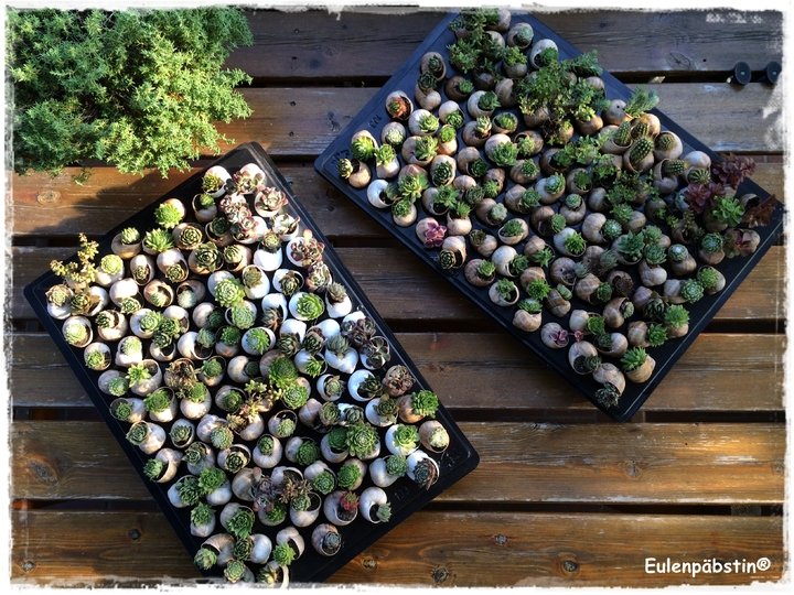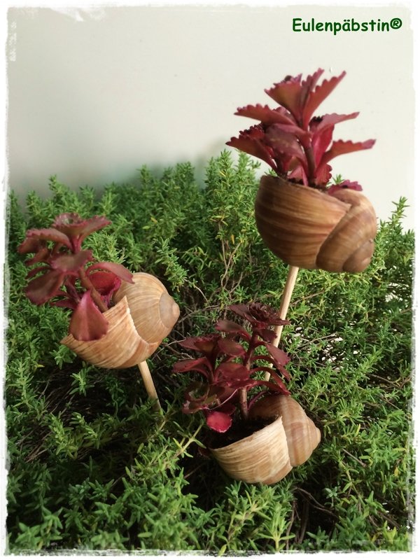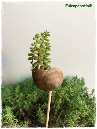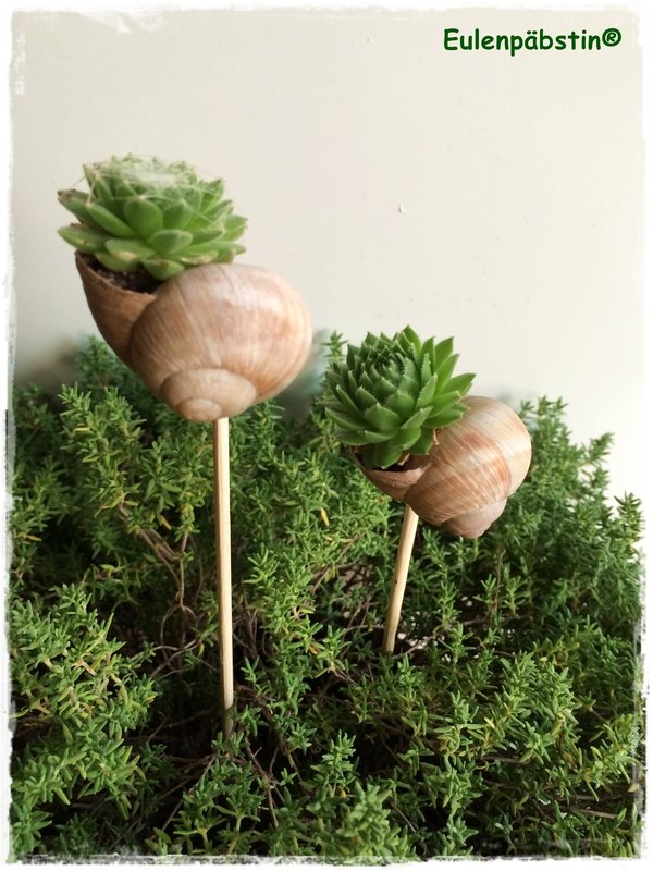Im Garten finden sich verschiedene Sorten der Pflanzen mit vielen Ablegern, die ihr jeweils in ein Schneckenhaus einpflanzen könnt. Oder ihr holt euch vom Gärtner einen Topf mit einer Hauswurz, die viele Pflanzenbabys hat.