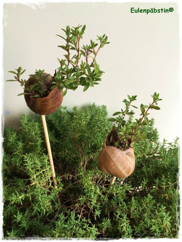 Das bepflanzte Schneckenhaus könnt ihr dann hübsch auf die Fensterbank legen, eure Pflanzentöpfe damit schmücken oder einfach als kleine selbstgemachte Aufmerksamkeit verschenken.
