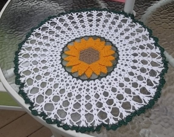 This listing is for a pdf crochet pattern to make this bright and cherry doubled layered pettaled sunflower doily pictured, not the finished items.