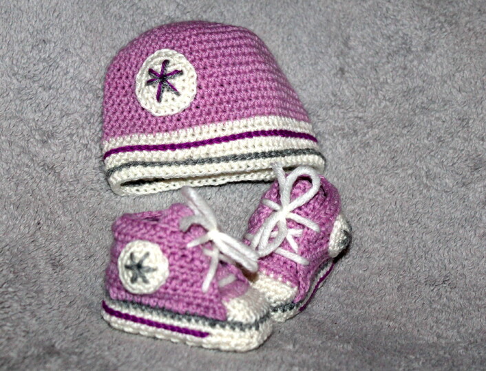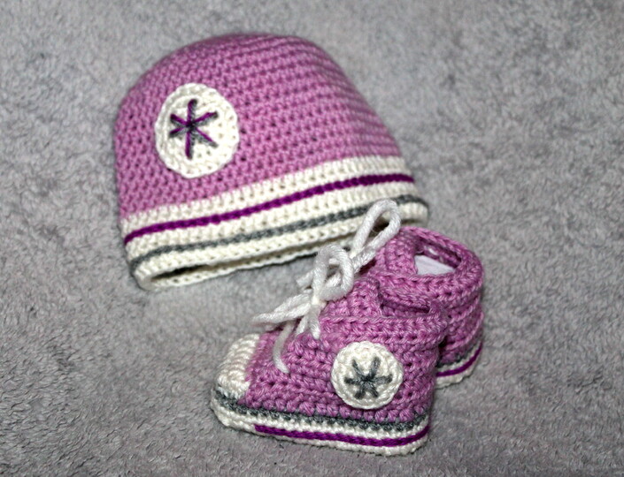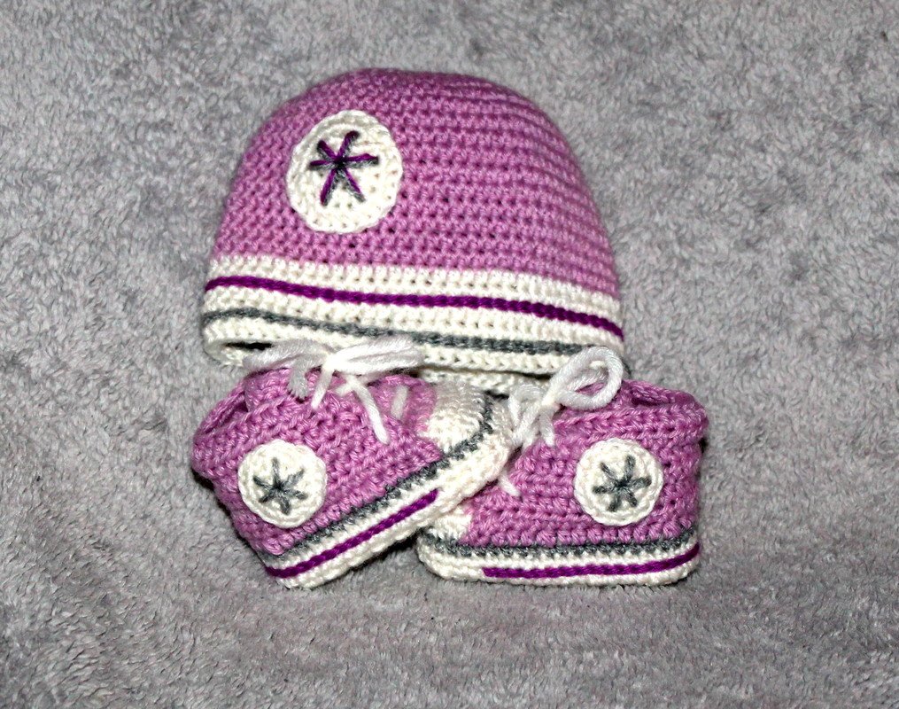 This crochet pattern describes how to crochet this beautiful sneakers and cap for a new born baby.