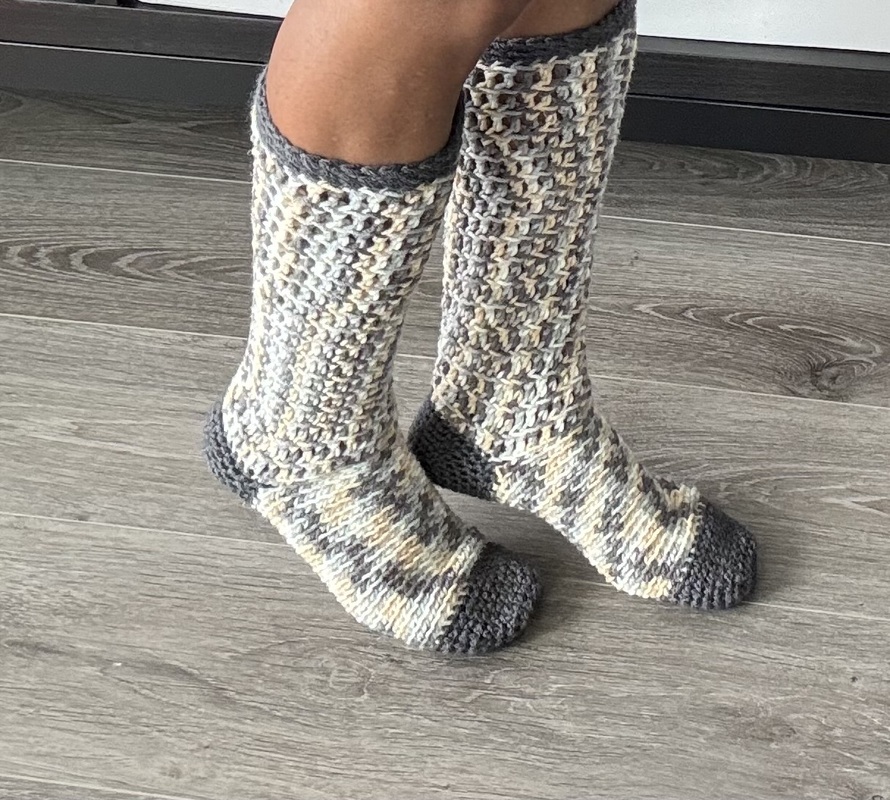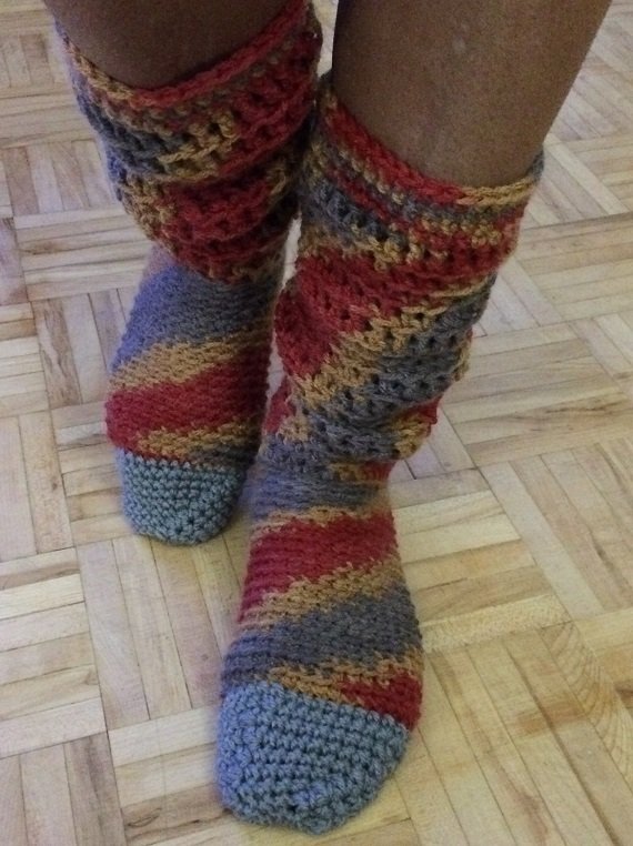 Yarn: 2 balls (145yd - 133m) Vanna’s Choice Lion Brand #4 Worsted Weight Yarn in Autumn Print (half ball of grey for toes and heels) or substitute a ball of Red Heart Super Saver 364 yds/333m/198g