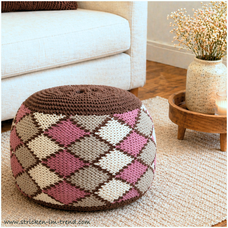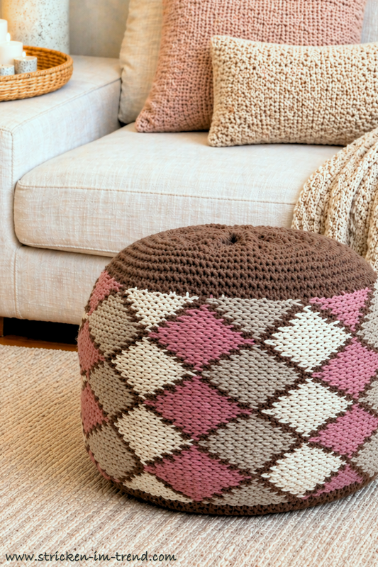 With this knitting pattern, you can create a modern round pouf with an elegant checked design – perfect as a seat cushion, footstool or decorative eye-catcher for your living room.