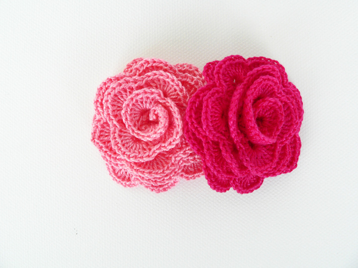 These roses are approx. 4-5 cm wide (10 cm with leaves). The thicker (thinner) your crochet yarn and crochet hook are, the larger (smaller) the roses will be.