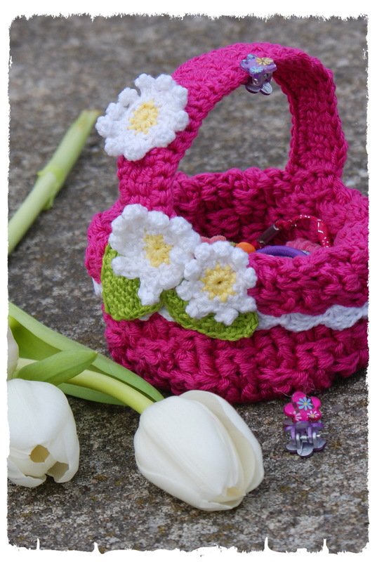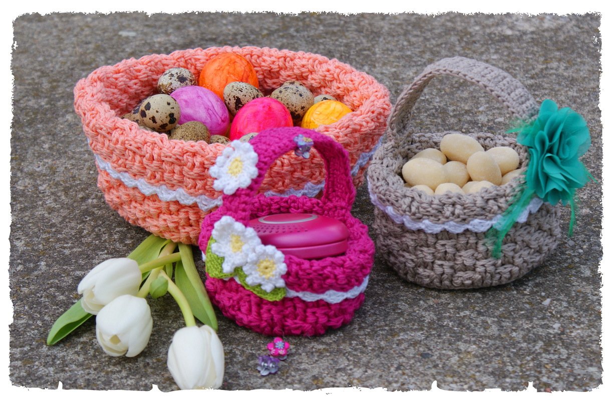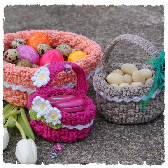 Das Muster ist sehr einfach aber sehr wirkungsvoll und vor allem stabil. Es sieht aus wie ein geflochtener Korb, hier in mädchenfarben und kleinen Gänseblümchen. Das Körbchen in apricot ist größer und eignet sich gut für größere Sachen oder Oster-Eier.