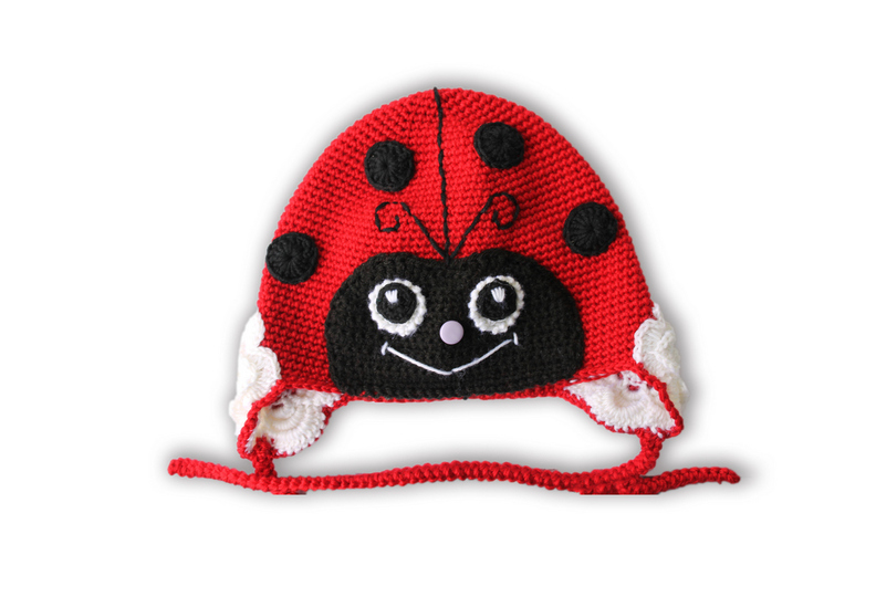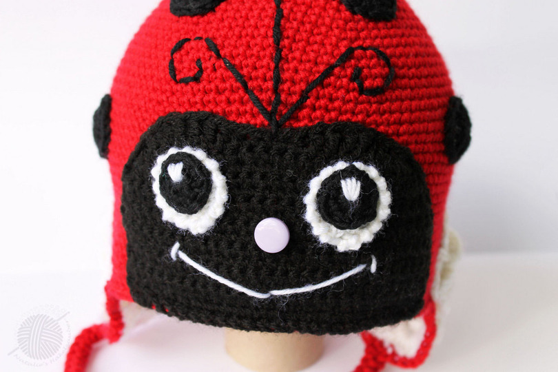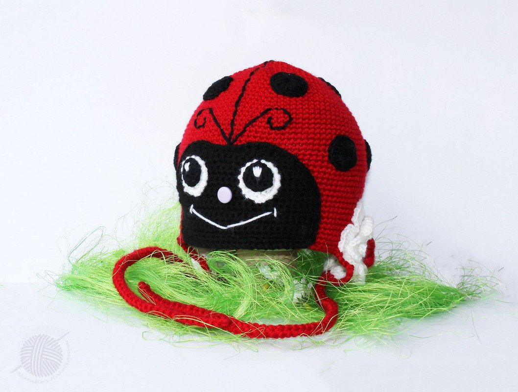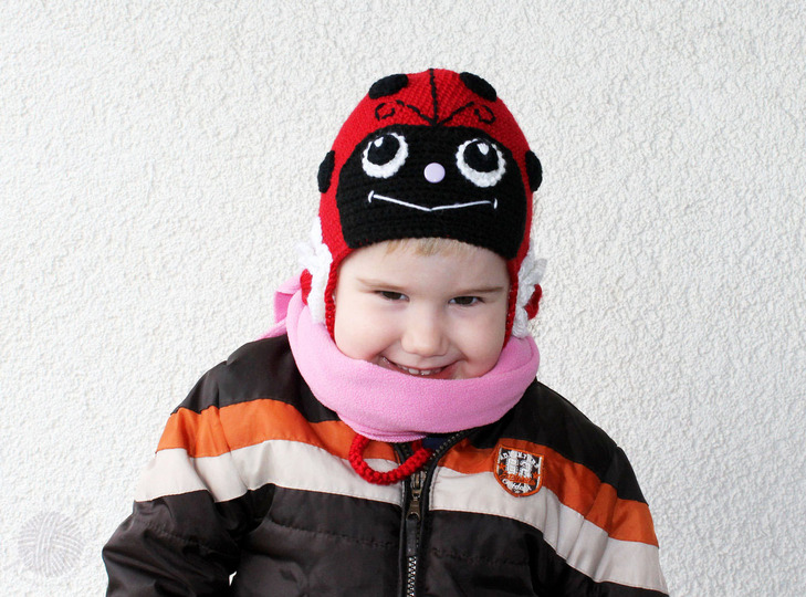 This PDF crochet pattern consists of illustrated tutorial for crocheting a hat in the shape of a ladybird with flowers as earflaps. The size is adjusted while crocheting the base of the hat (explained in the pattern).