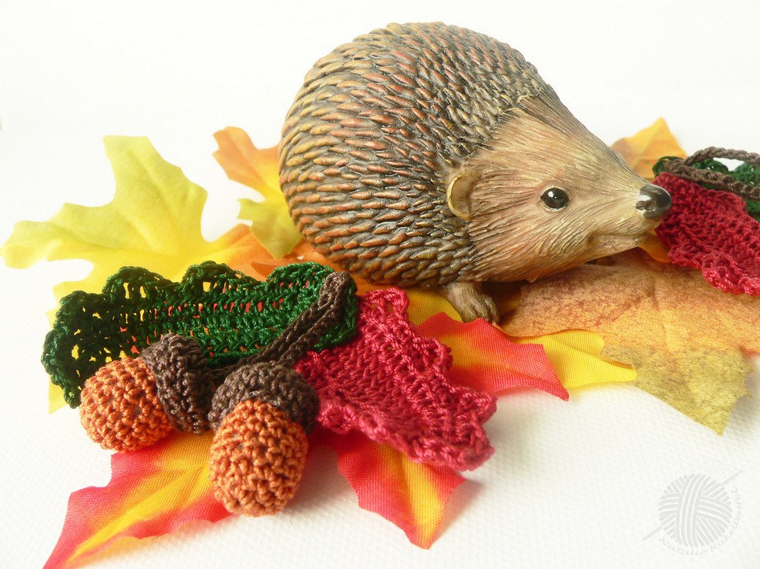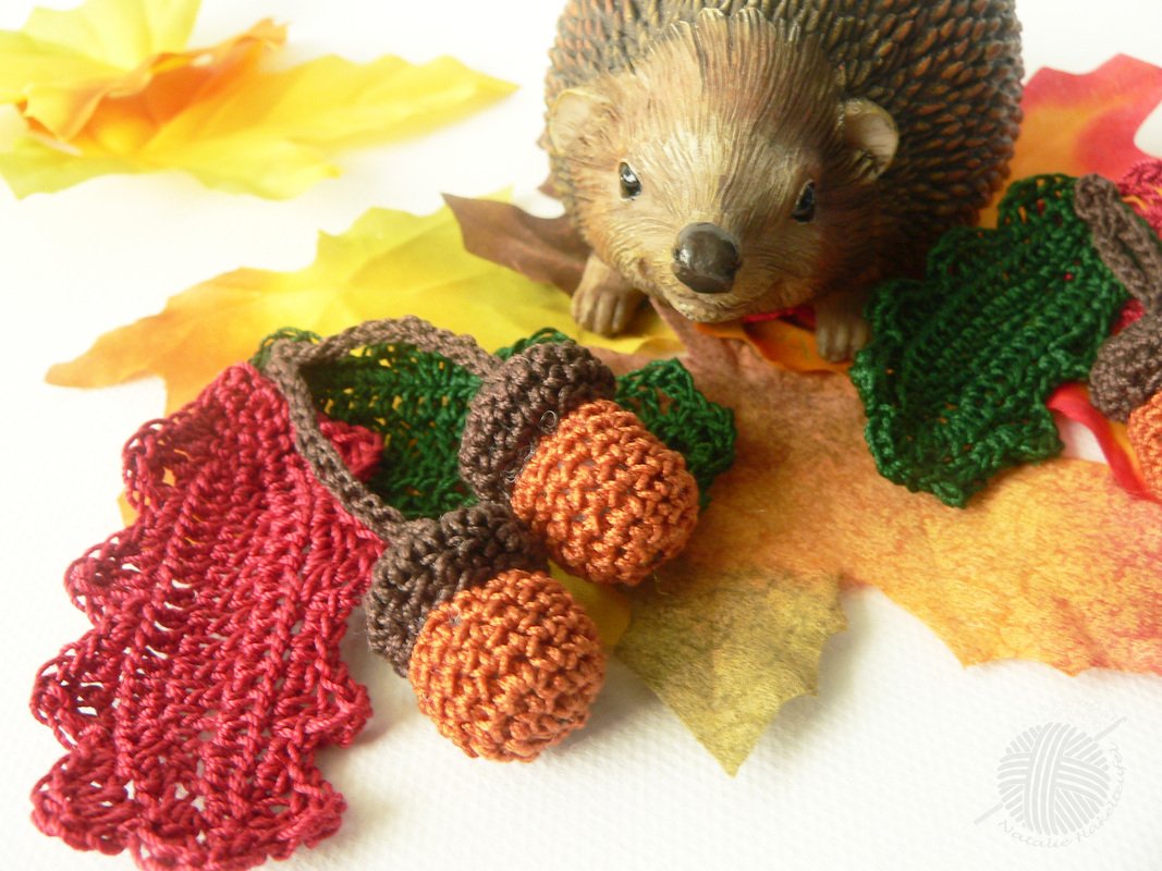 Diese Eicheln sind ca. 2-3cm lang, Blätter sind ca.6 cm lang. Physalis ist ca. 3cm lang und 3cm breit, Zweig mit den Blättern ca. 11cm lang. Je dicker(dünner) Ihr Häkelgarn und Häkelnadel sind desto größer(kleiner) werden die Eicheln.