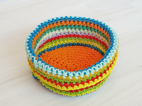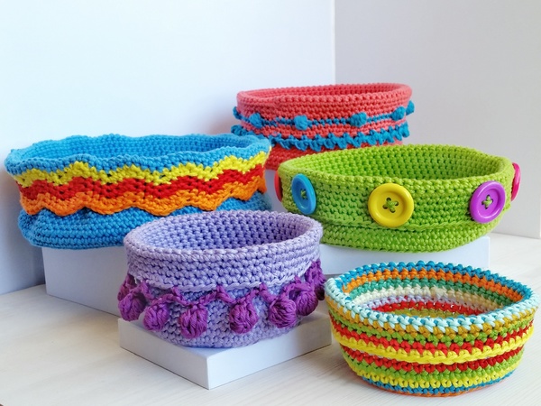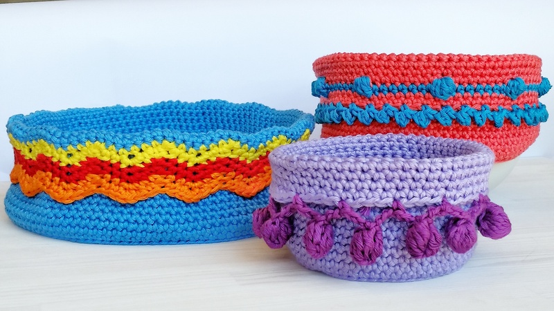 Bunte fröhliche Dekoration, Aufbewahrung für Kleinigkeiten, Obst- oder Brotkorb oder niedliche Verpackung für Geschenke - mit dieser umfangreichen und vielseitigen Anleitung entstehen in kurzer Zeit wunderschöne Körbchen in 3 Größen, 2 verschiedenen Höhen und tollen Mustern!
