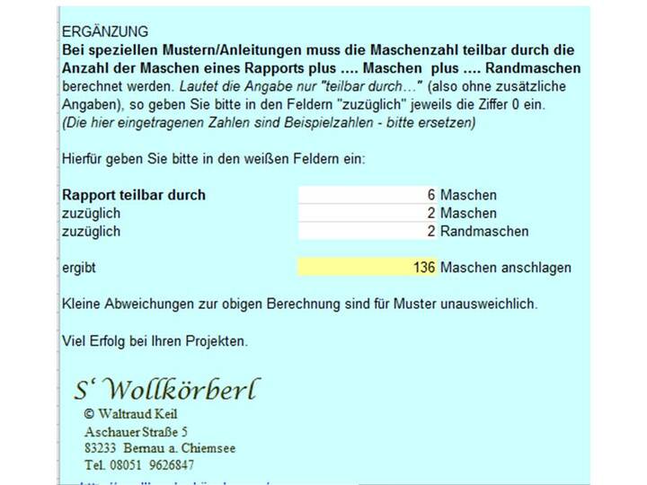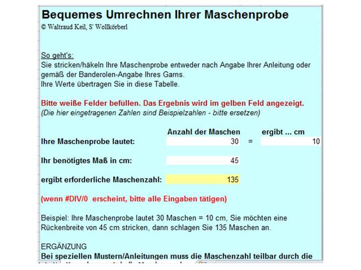 Diese Excel-Tabelle ist ein Hilfsmittel zur Umrechnung Ihrer persönlichen Maschenprobe in die erforderliche Maschenzahl für Ihr Strick-/Häkelprojekt.