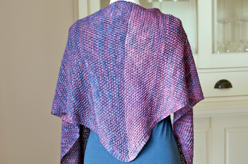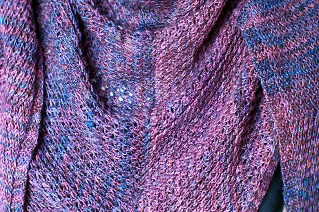 "Joanna” is an easy to knit triangle shawl with an interesting surface. The combination of the hand-dyed yarn and the stripes of changing left and right leaned crosses (resp cables) make it a real eyecatcher.