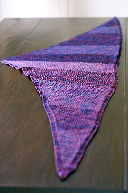 This shawl is knitted sideways: You start knitting at one end of the length side and increase sts on one side only. Having reached the bottom tip you continue by decreasing those stitches again. It’s a perfect method, if you only have 2 skeins of wool - just stop increasing at the end of the first skein and start decreasing with the second skein. So you can always be sure to have enough yarn.