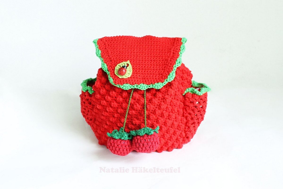 The PDF crochet pattern consists of illustrated tutorial for crocheting a children's raspberry-shaped rucksack (2 versions: with and without lid) with side mesh pockets. Crocheted from Katia ‘Capri’ and Katia ‘Mali’.