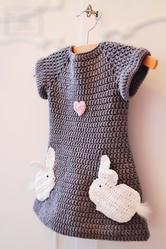 You can crochet with my pattern this exquisite girl dress Bunnies in Love for your little girl or as a special personal gift for your family & friends. The Patterns of the bunnies and of the heart are included of course!