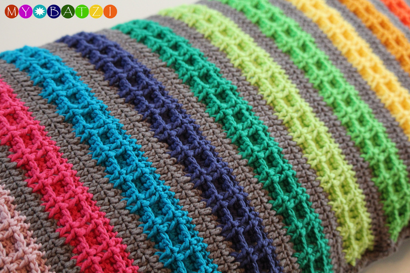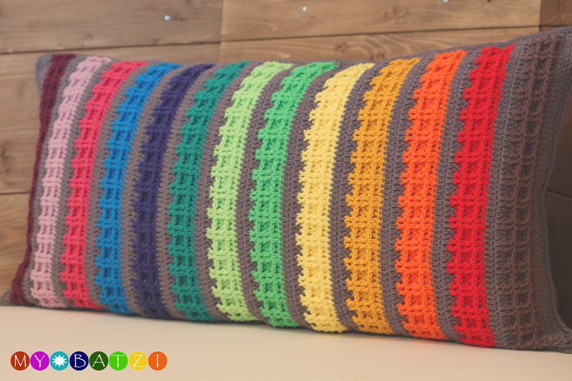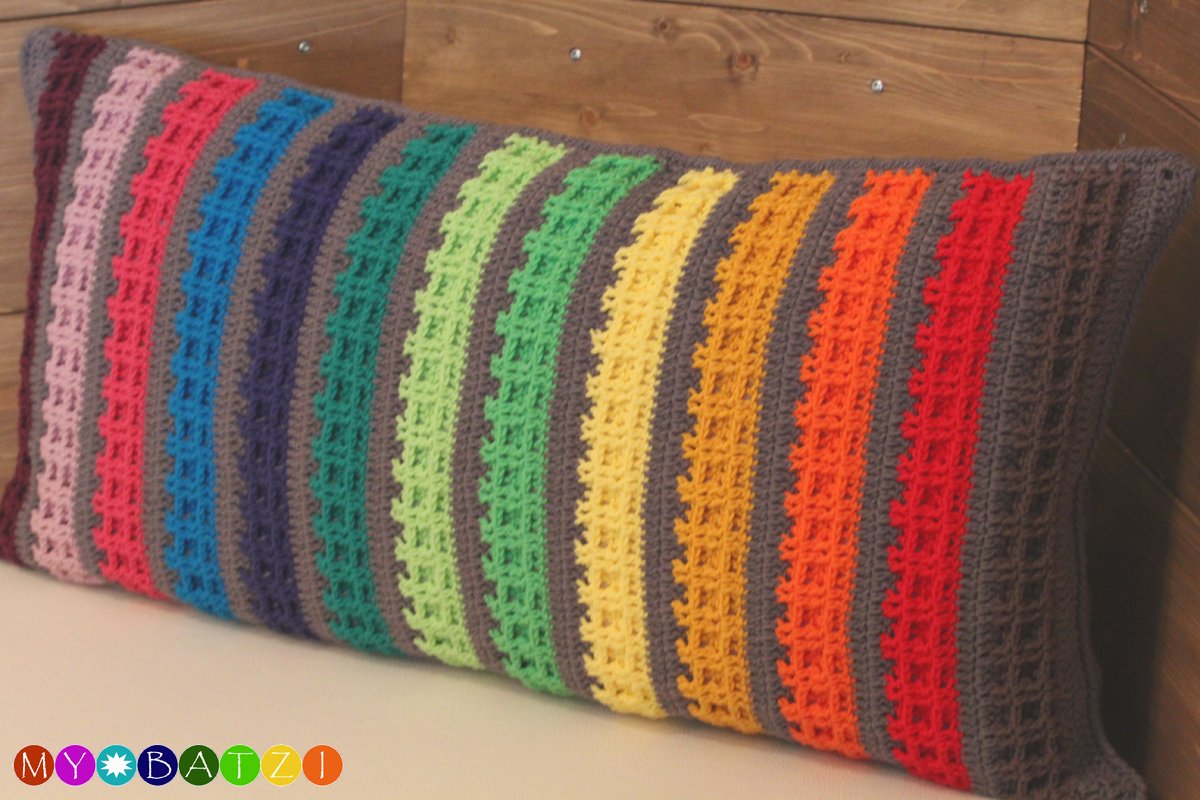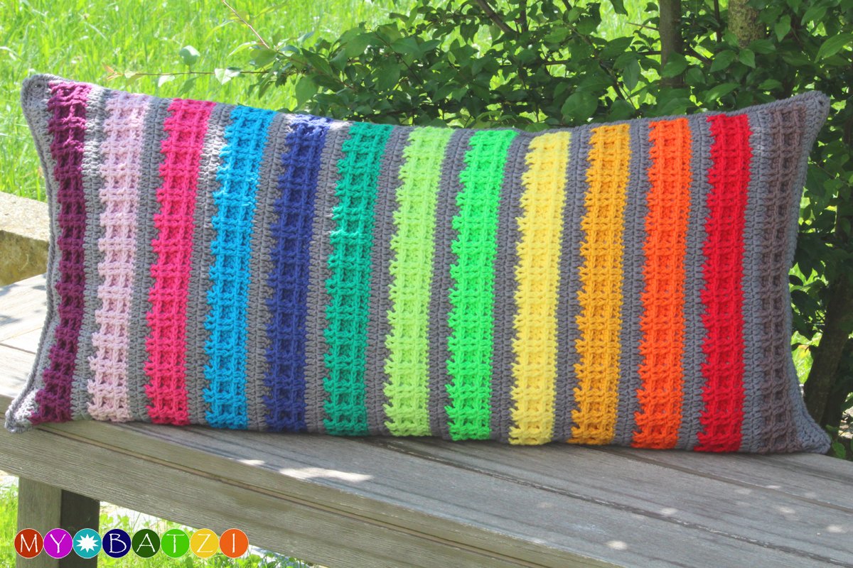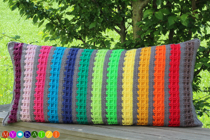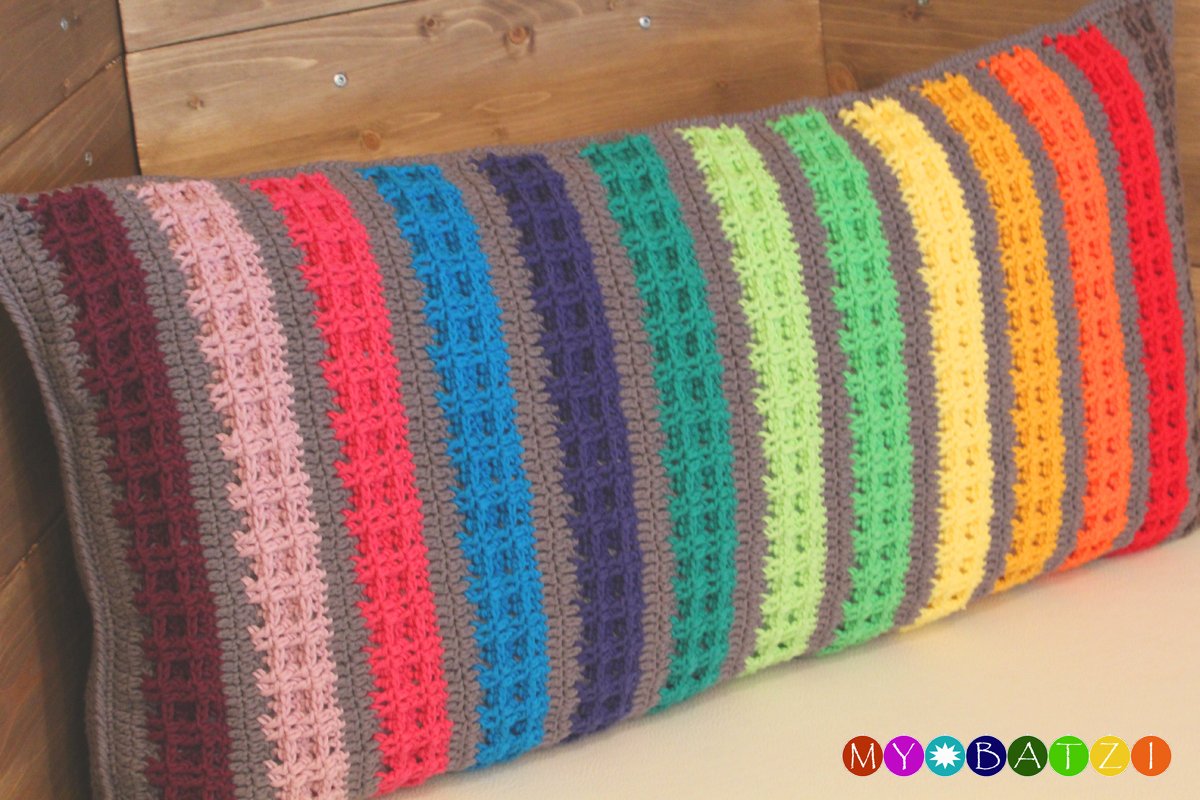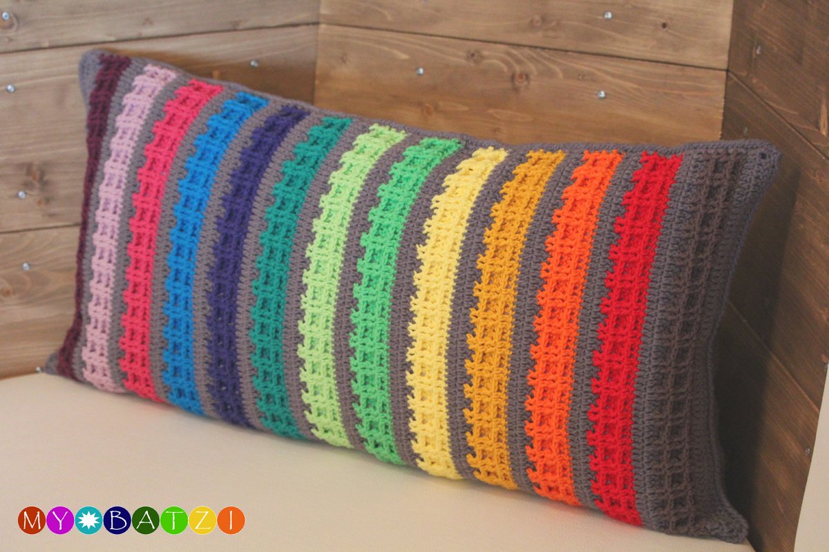 Dieses Kissen ist flauschig weich und kann wunderbar als Kuschelkissen verwendet werden. Und mit seinen schönen Regenbogenfarben eignet es sich natürlich auch als schönes Deko-Kissen. Ganz so, wie du es willst. Und zur Reinigung kannst du das Kissen gleich vollständig in die Waschmaschine geben und nach Anweisung des Wollherstellers waschen. So bleibt es lange Zeit frisch.