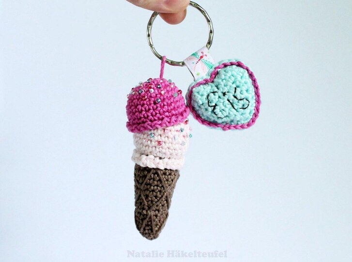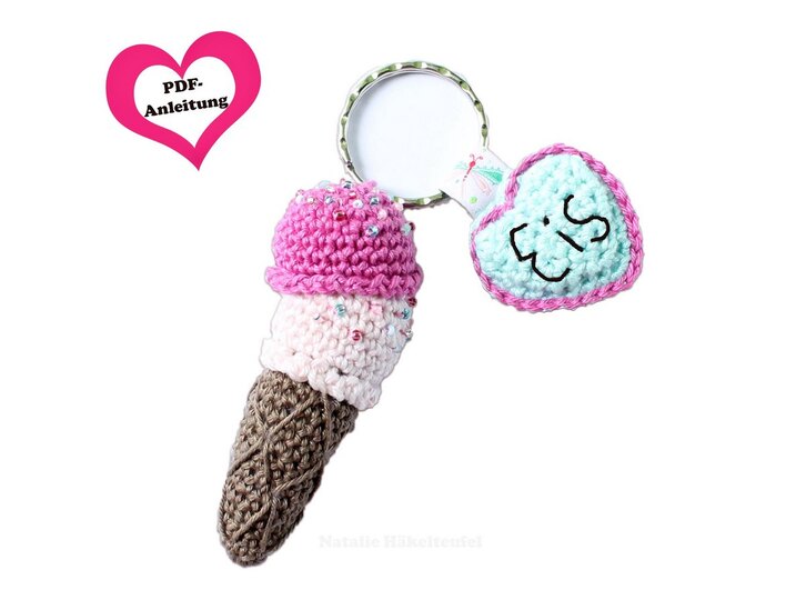 Die umfangreiche, reichlich bebilderte PDF-Häkelanleitung zum Häkeln von Anhänger/Taschenbäumler "I love Eis" zum Dekorieren des Hauses oder als Mitbringsel für die Freunde. Das Eis kann man auch als Schlüsselanhänger benutzen.