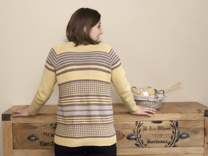 A classic top down raglan cardigan with stripes in 3 colors (unbuttoned).
