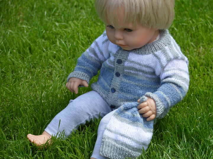 Niedlich anzusehen und so richtig ausgehfein! Dieses Jäckchen und die dazu passende „Knotenmütze“ sind schnell auch aus Sockengarn-Resten gestrickt. – und, welche Garnreste schlummern noch in Ihren Schränken?