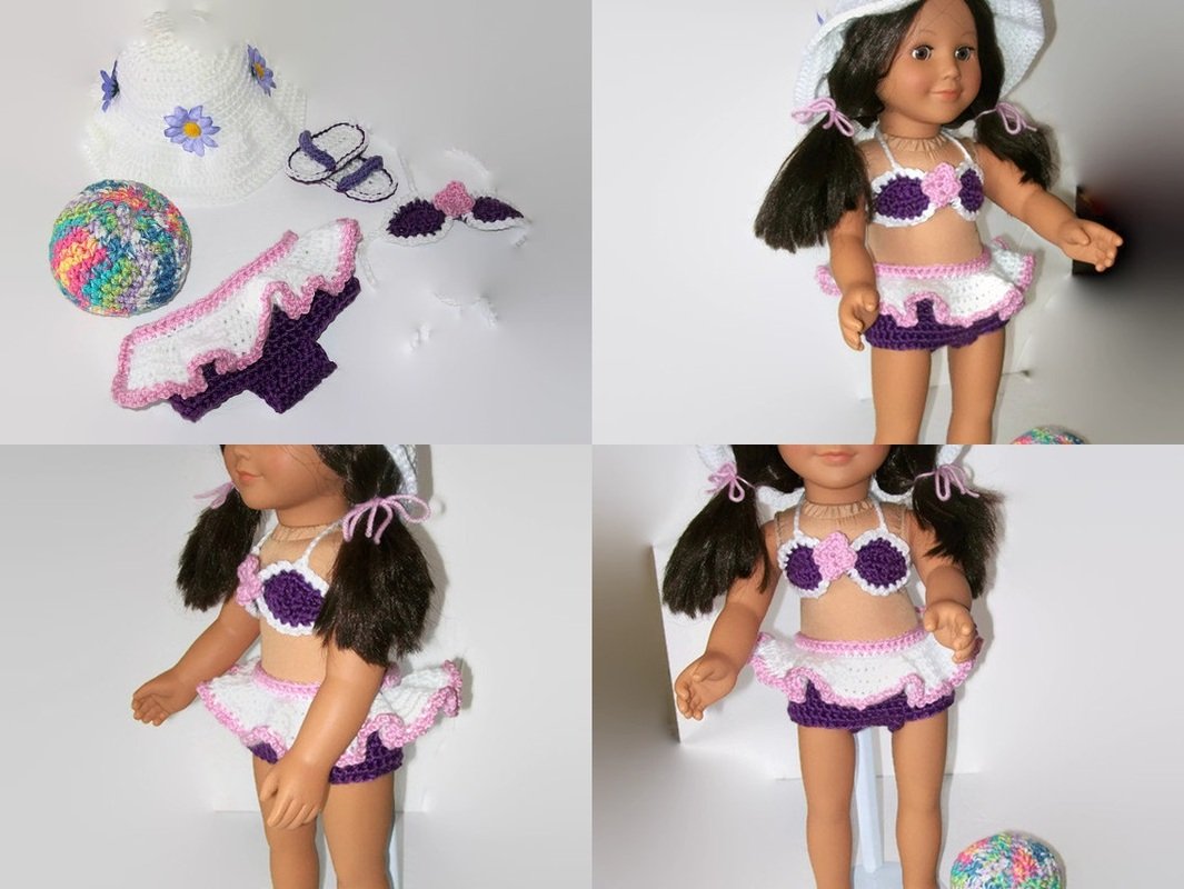This is the cutest little pattern. Instructions are for, beach ball, bikini bottoms with attachable skirt, bikini top, hat and sandals. How adorable will this look on an 18" doll. Makes a perfect gift for all of us doll lovers. Change the colors up, mix and match with some of my other doll patterns, and have a whole wardrobe.