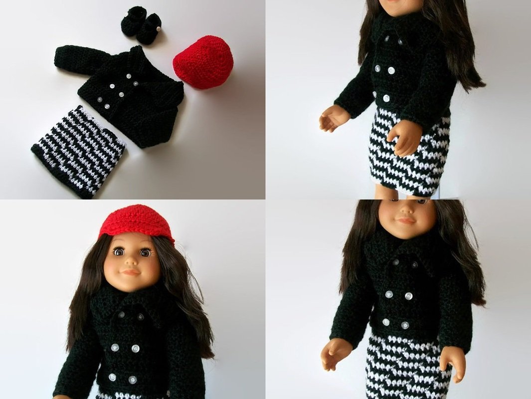 She will look like she is off to Paris in this little ensemble. Pattern includes instructions for skirt, jacket, hat and shoes. It is easy, quick and loads of fun to make. Makes a great gift for any little girl, or big girl for that matter. A perfect outfit to add to any doll lover's closet.