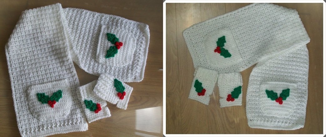 Beautiful scarf with holly and berries for those chilly days and nights. The scarf has two little pockets for those little items any kid has to have with them. Also great for chilly nights at home wrapped around your child while watching t.v. The gloves are adorable with the holly and berries, and easy access for your little munchkin to still be able to use their hands. The pattern is for sizes 2-8 children.
