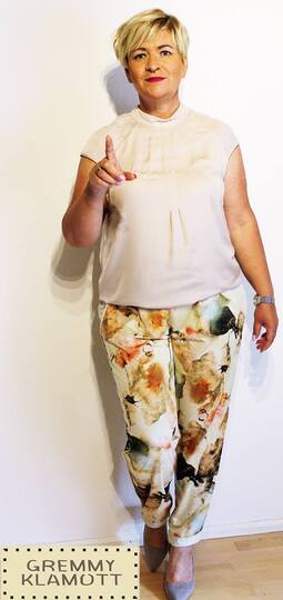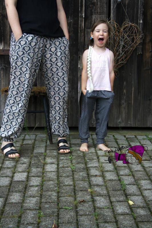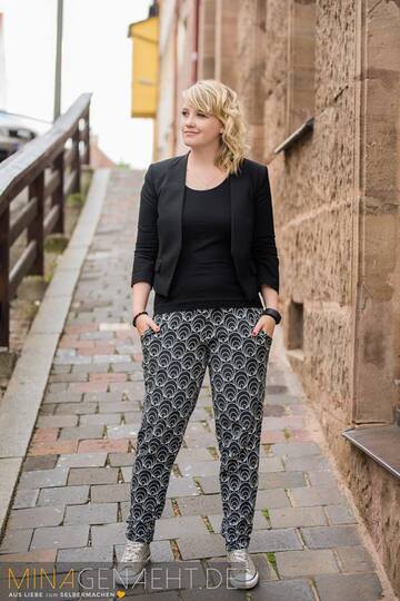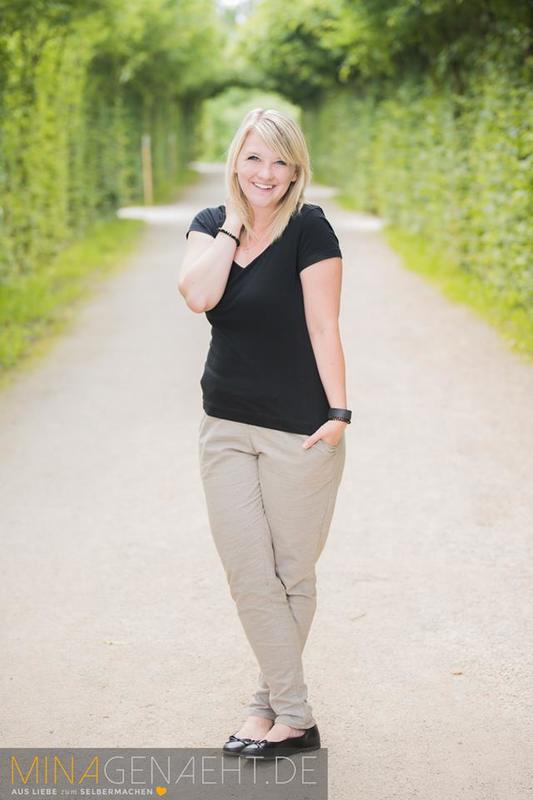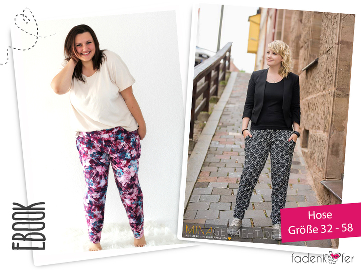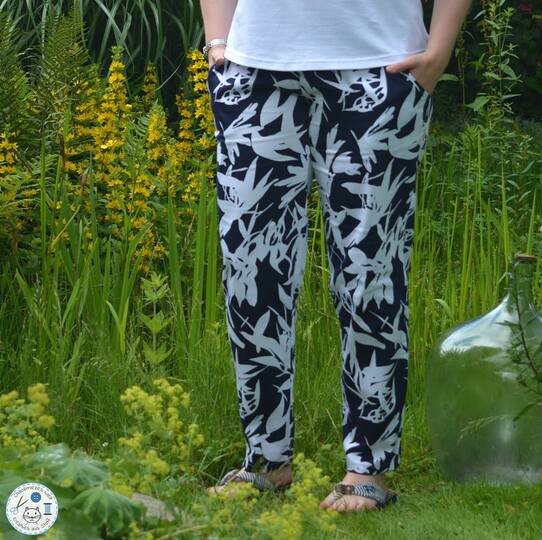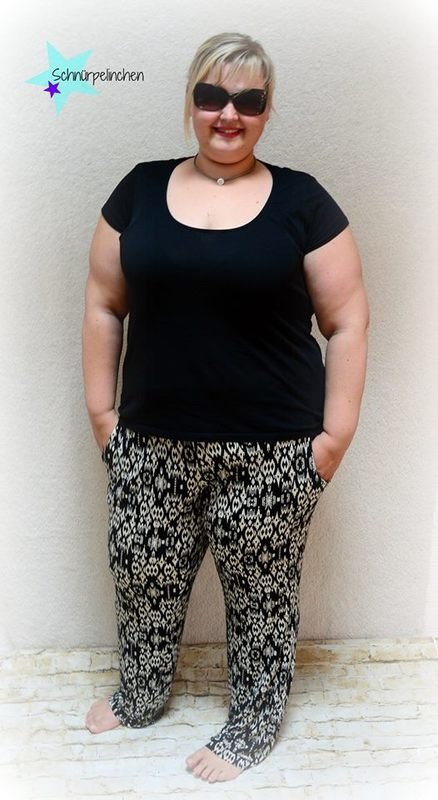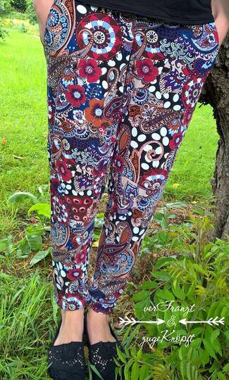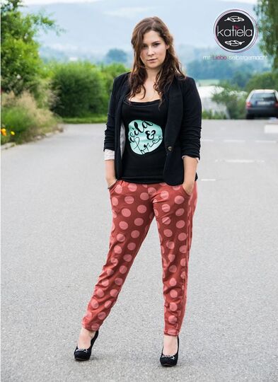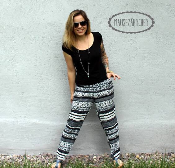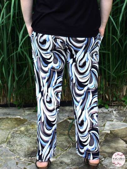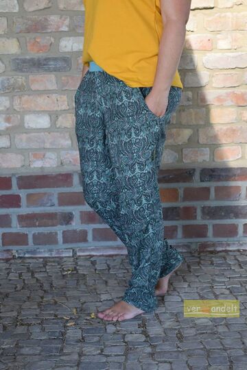 Die Hose Pamina kann aus verschiedenen Stoffen genäht werden. Besonders gut eignen sich Viskose, Seide oder dünner Stretchjersey, leicht fließende Webware, Viskose oder Voile.
