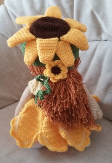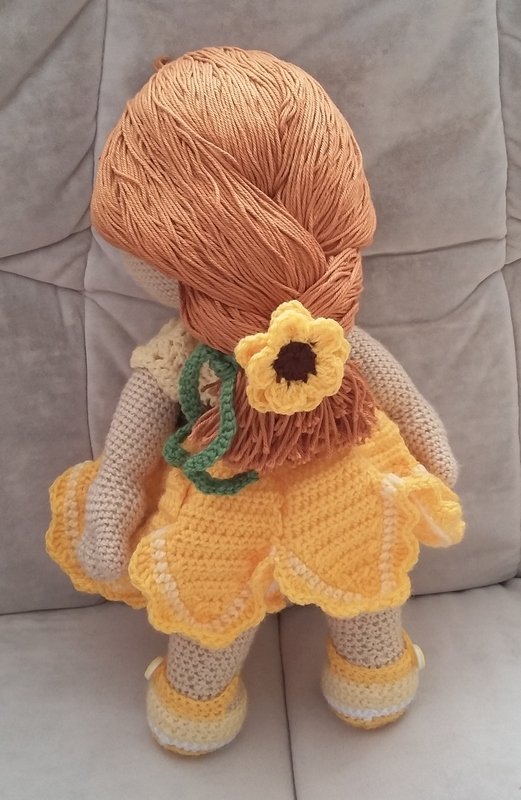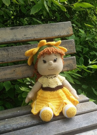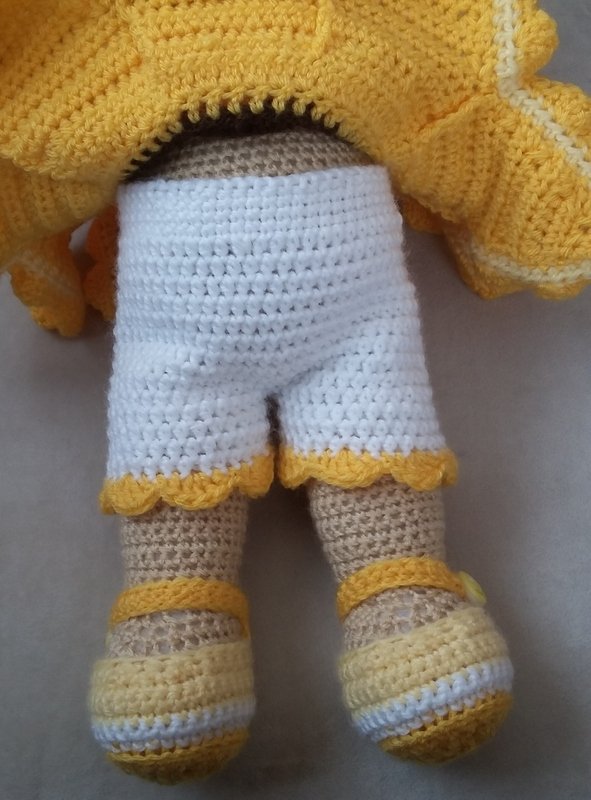 Die PDF beinhaltet die Anleitung für die Puppe, das Kleid, das Höschen, die Schuhe, das Haarband, sowie den Sonnenblumenhut.