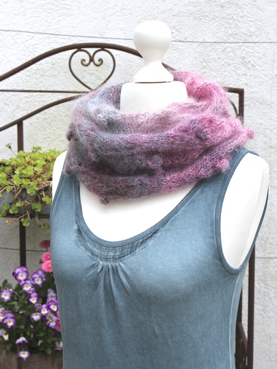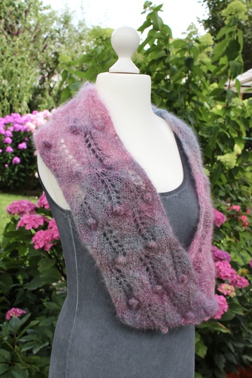 LILY is a very soft, romantic cowl with a simple lace pattern and nubs and with its 50 g it is as light as a bird's feather! Thanks to the double-stranded yarn, this cowl can be knitted in no time at all! You can unwind a gradient mohair-yarn from the outside and inside at the same time or combine a gradient yarn with a matching solid color or you can use 2 different solid colors, which all results in beautiful mélange effects - but the pattern also looks great in a single color!
