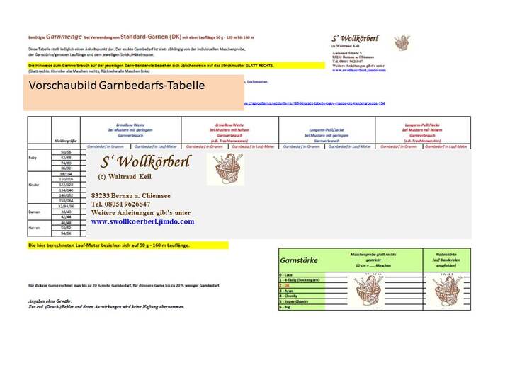 Zudem sind allgemein gültige Angaben hinsichtlich Maschenprobe und Nadelstärke für die unterschiedlichen Garnstärken Lace, 4-fädig, DK, Aran, Chunky, Super Chunky und Big enthalten.