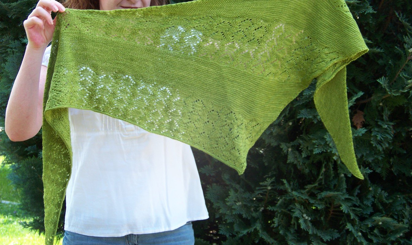 Das Tuch Sanima wird mit wenigen Maschen begonnen und durch seitliche Zunahmen immer weiter vergrößert. Die kraus rechts gestrickten Teile können gemütlich vor dem Ferneher gestrickt werden. Der Laceteil wird nur auf der Vorderseite gestrickt und die Rückseite wird mit linken Maschen gearbeitet.